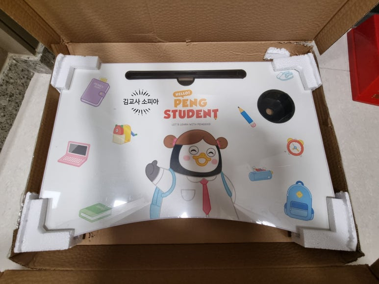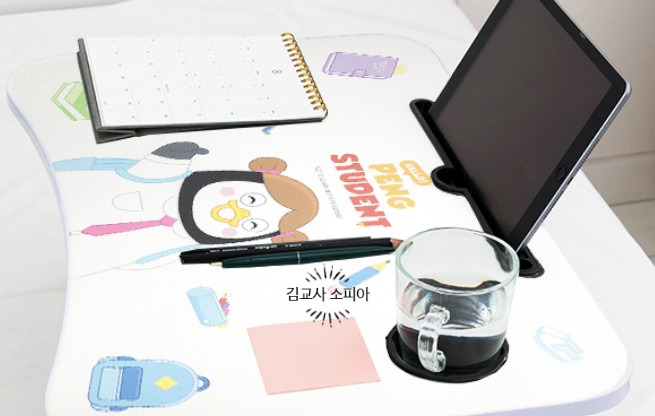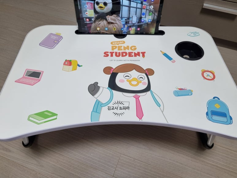 노트북과 책, 태블릿까지 넉넉하게 올릴 수 있는 상판 크기! 펭수 캐릭터가 큼직하게 프린팅 되어 있어 보는 것만으로도 기분이 좋아집니다. 방 인테리어에 귀여운 포인트가 되어주었어요 💛